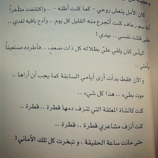 كان الأمل ينعش روحي - كما كنت أظنه - .. واكتشفت متأخراً أنه سم زعاف كنت أتجرع منه القليل كل يوم ,، وأدع باقيه لغدي ،, حتى قتلت نفسي .. بيدي !